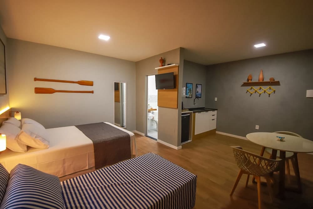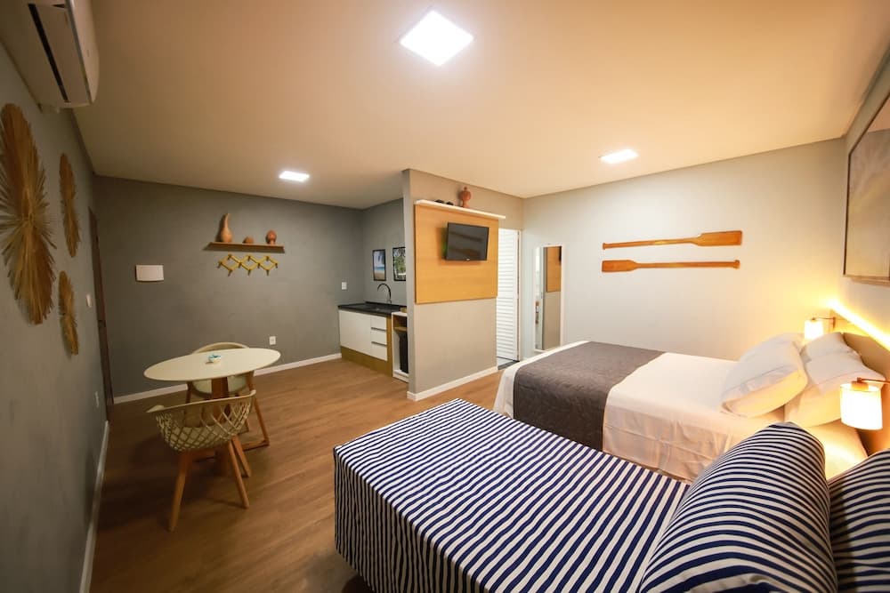 Sinta-se em casa em um de nossos 6 quartos com ar-condicionado que apresentam cozinhas americanas com micro-ondas e máquinas de café expresso. Os quartos possuem pátios particulares. Nos quartos, você encontra TVs de tela plana com canais via satélite para a sua diversão, além de Wi-Fi de cortesia para navegar na web.
